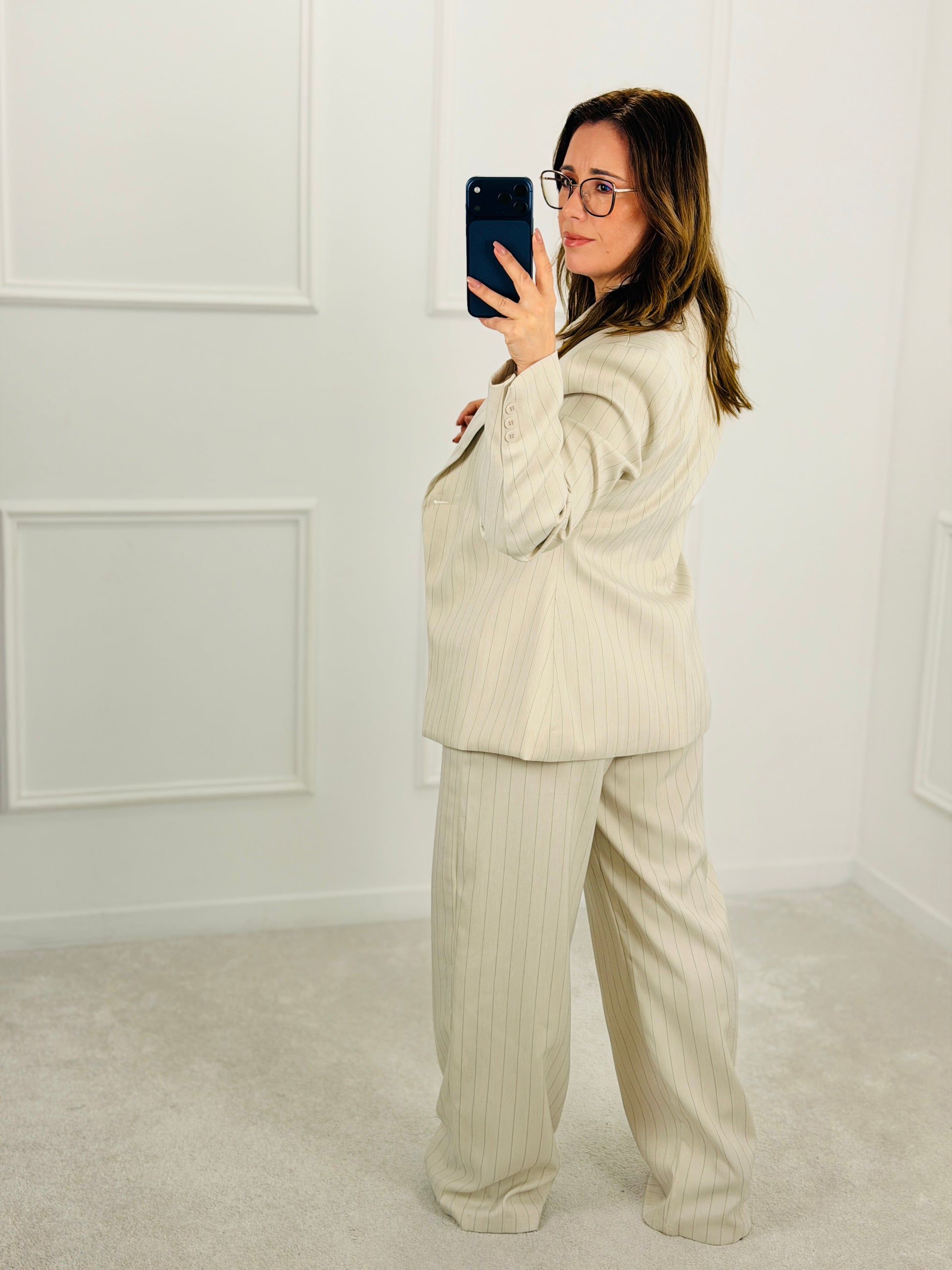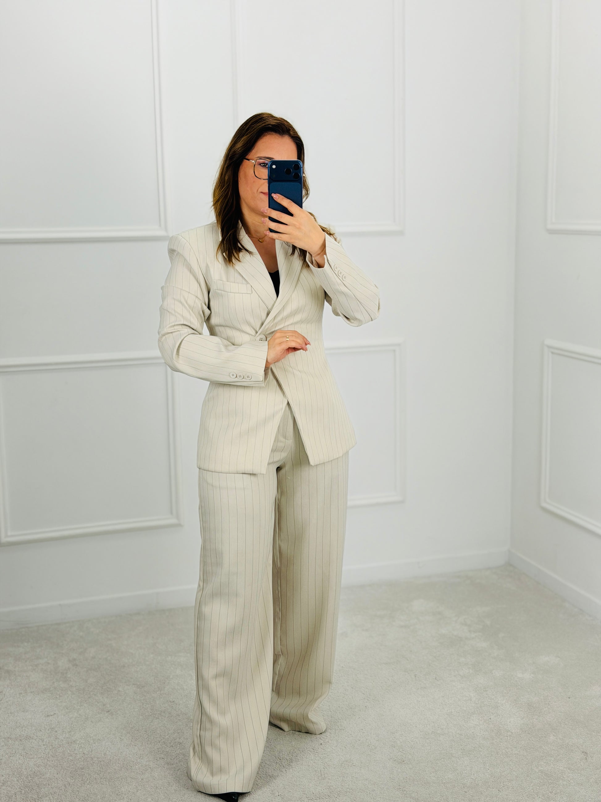 Conjunto de blazer estruturado com calças de corte fluido, numa risca de giz suave que alonga a silhueta e dá um toque sofisticado.