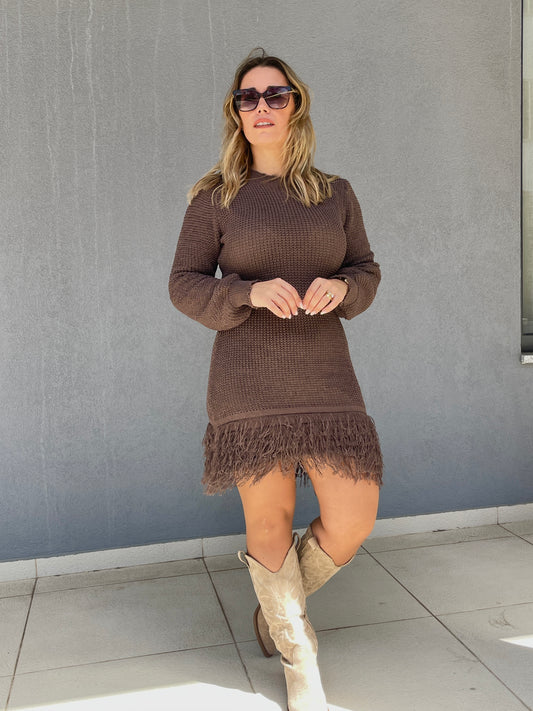 VESTIDO DE MALHA COM FRANJAS CASTANHO