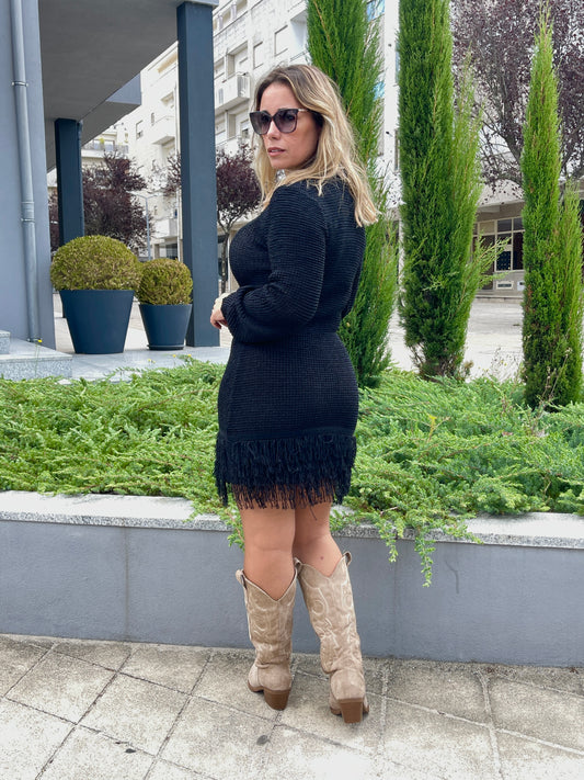 VESTIDO DE MALHA COM FRANJAS PRETO