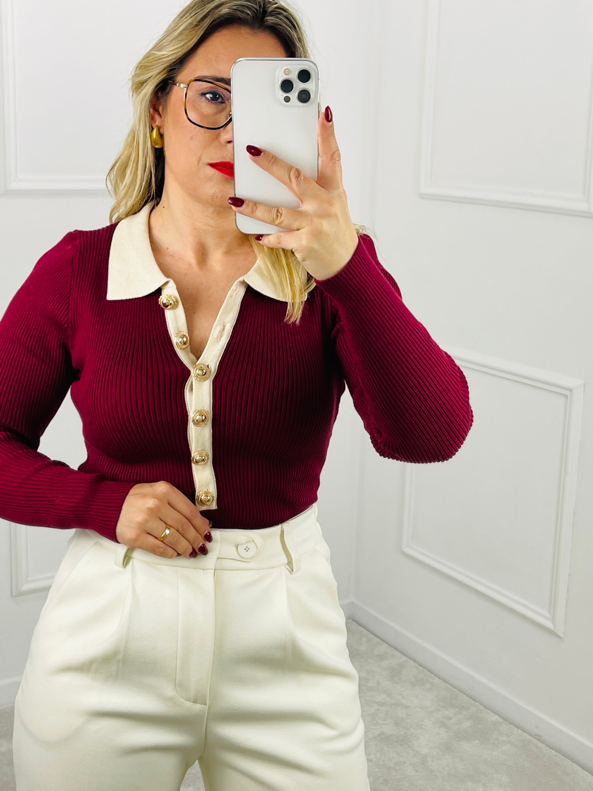 BODY MALHA BORDEAUX COM BOTÕES DOURADOS