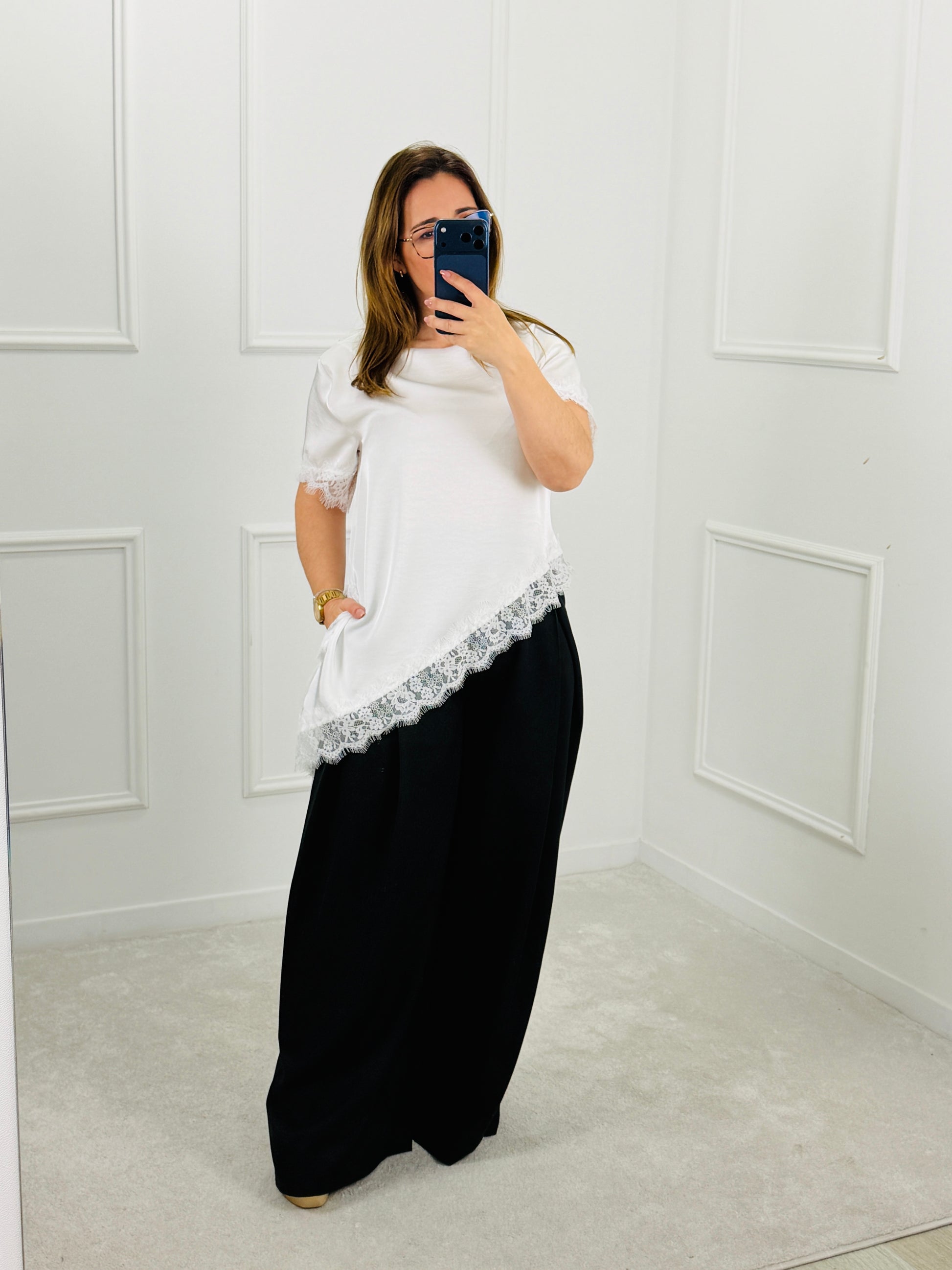 Camisola em cetim com detalhe de renda, leve e fluida, ideal para conjugar de forma simples e sofisticada. Disponível em tamanho único, veste até L.