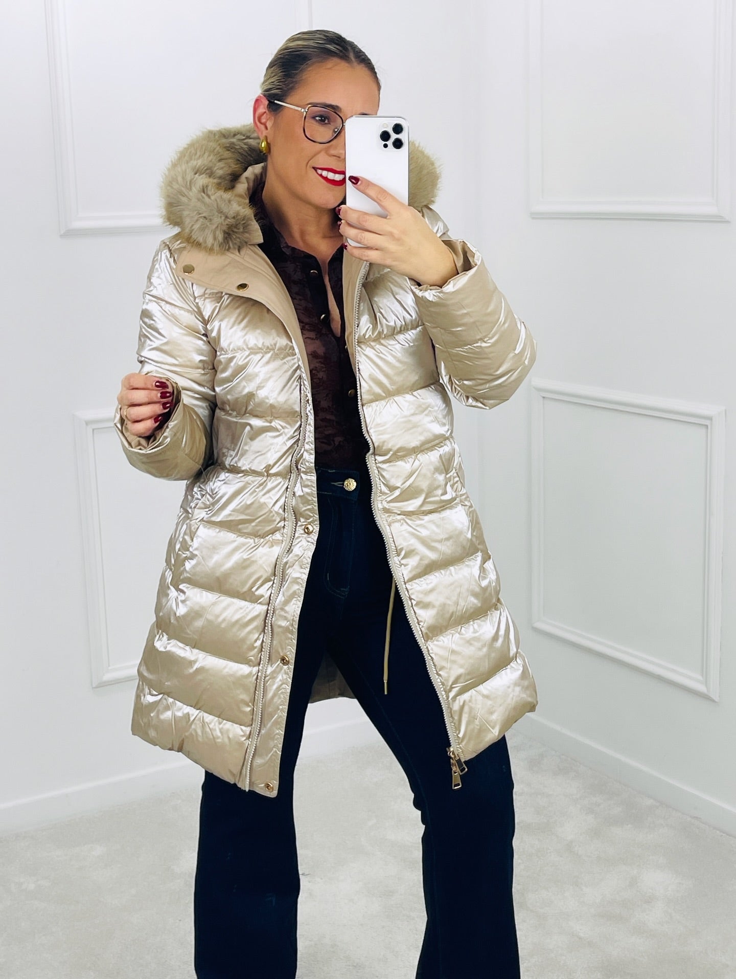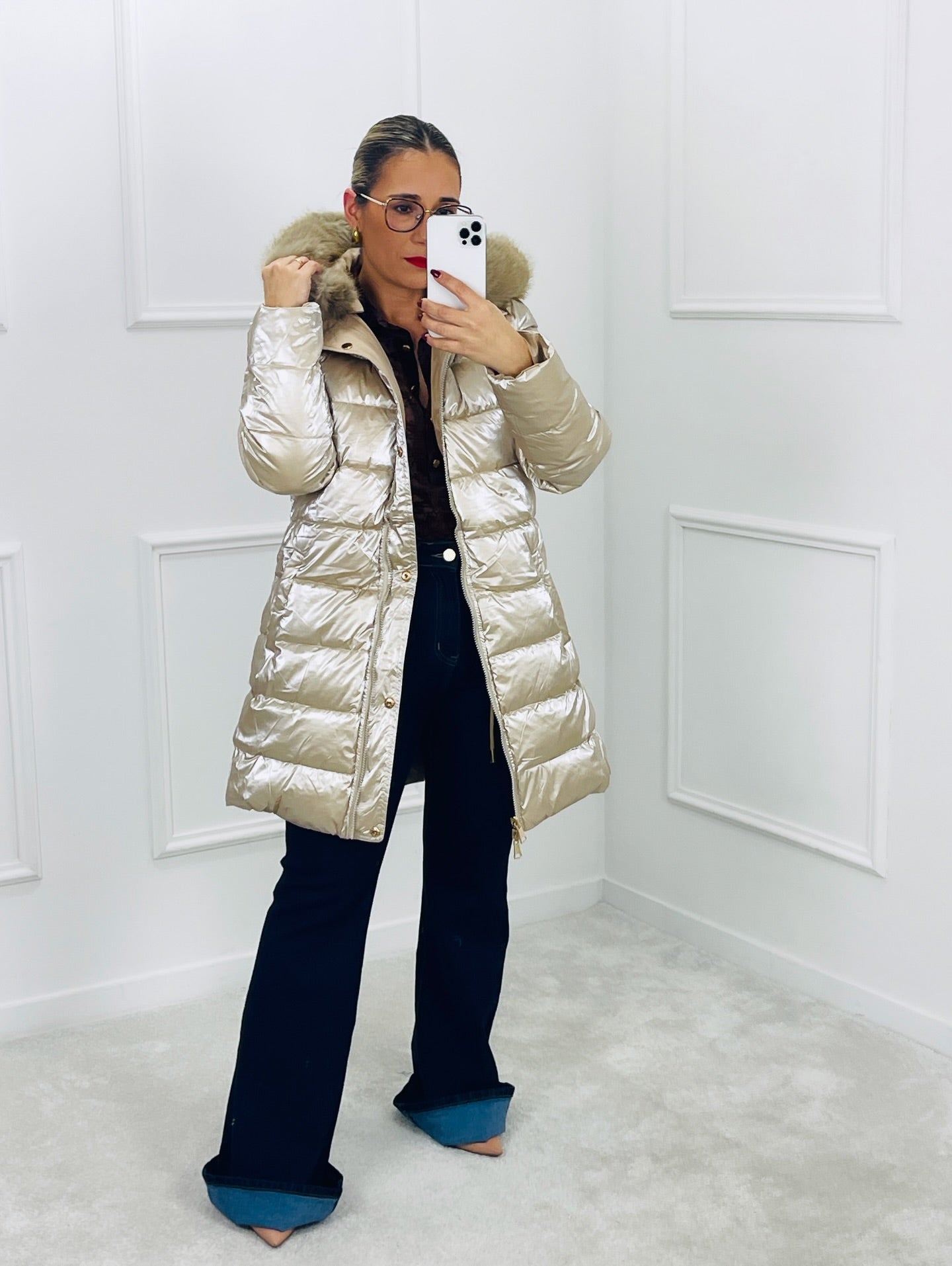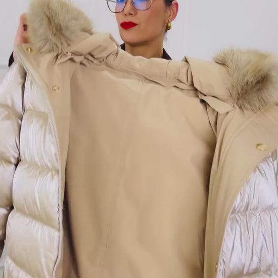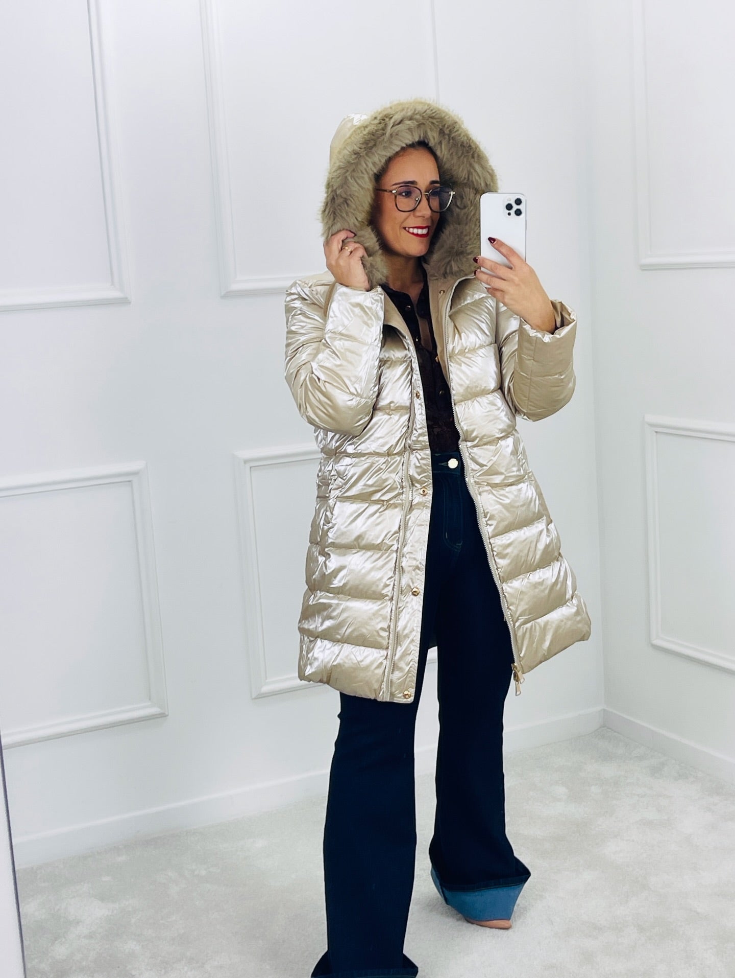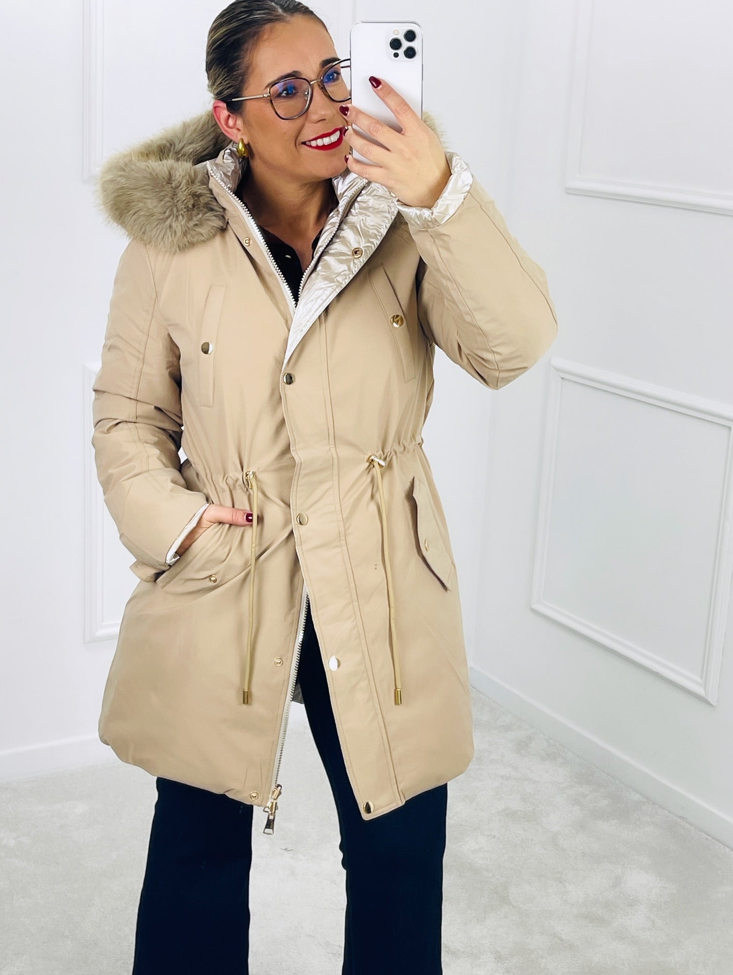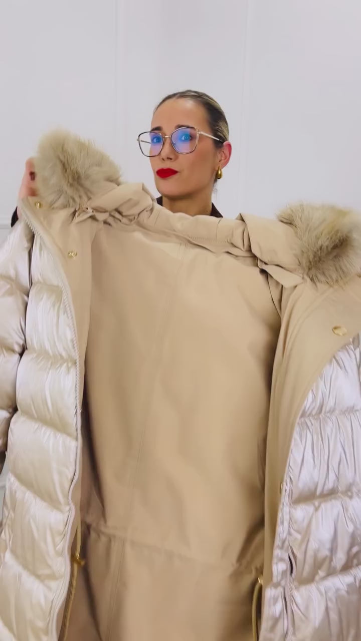 Um casaco super versátil e perfeito para enfrentar o frio com estilo. Sendo dupla face, permite-lhe dois looks num só: de um lado o brilho elegante do dourado, do outro o tom bege clássico e discreto.