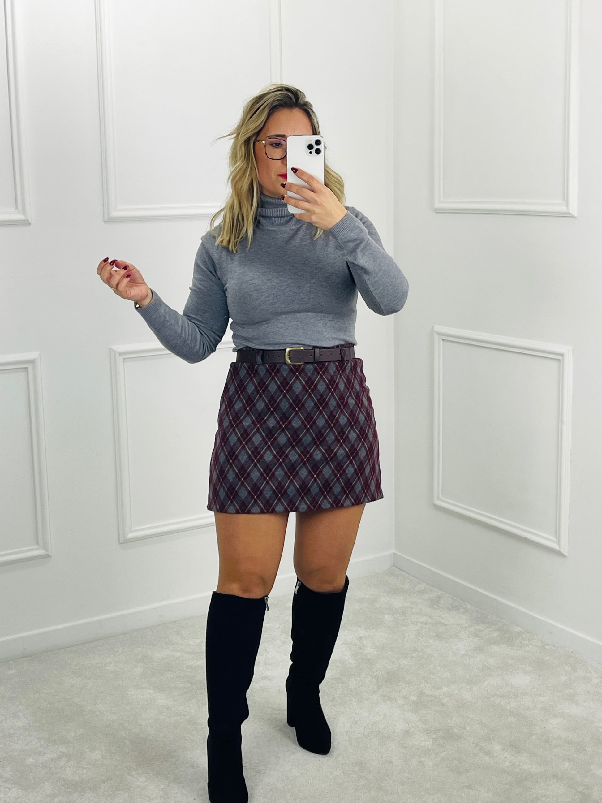 Uma saia cheia de charme, com padrão xadrez em tons de burgundy e cinza que elevam qualquer look de outono/inverno. O corte reto alonga a silhueta e o tecido estruturado mantém a peça sempre impecável.