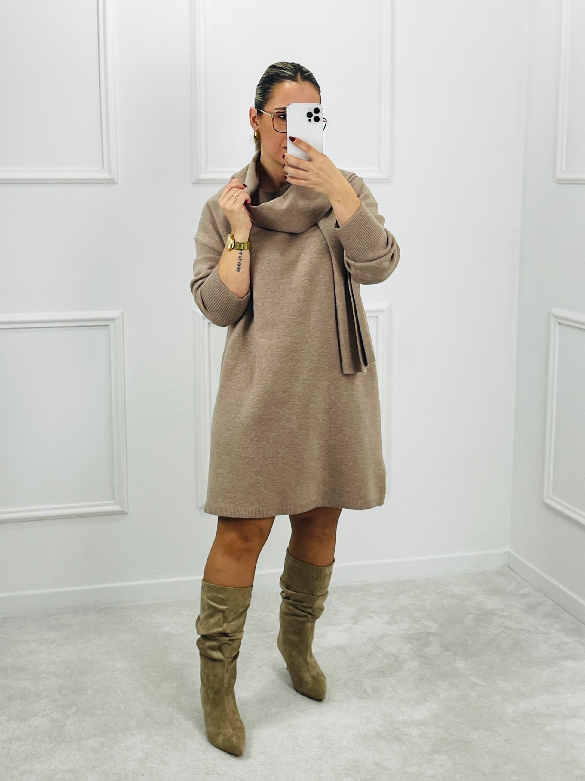 Um vestido em malha super confortável, com aquela gola tipo cachecol que dá imediatamente um ar elegante e moderno. A suavidade do tom camel torna-o perfeito para usar no dia a dia ou em looks mais arranjado e num instante.