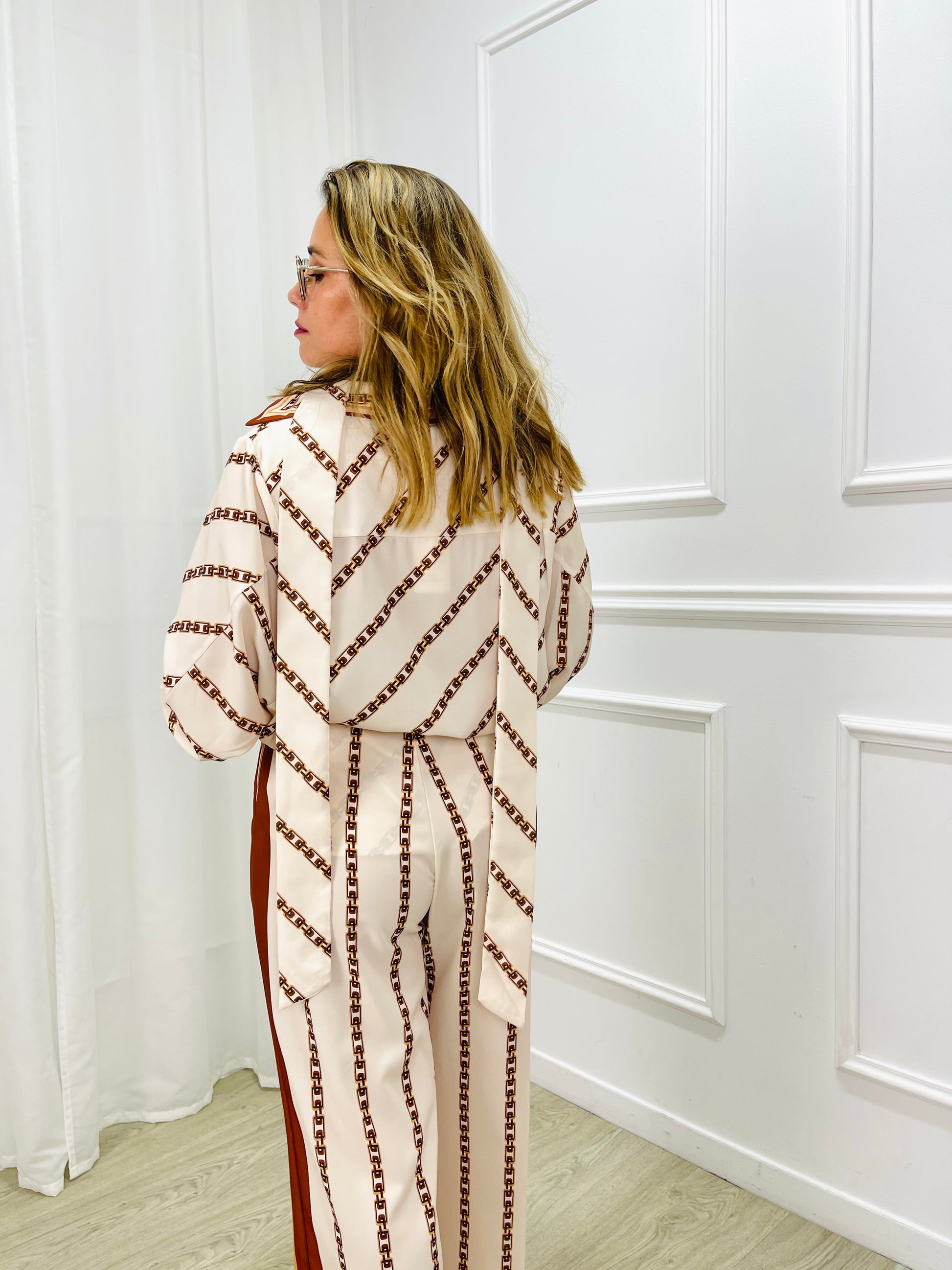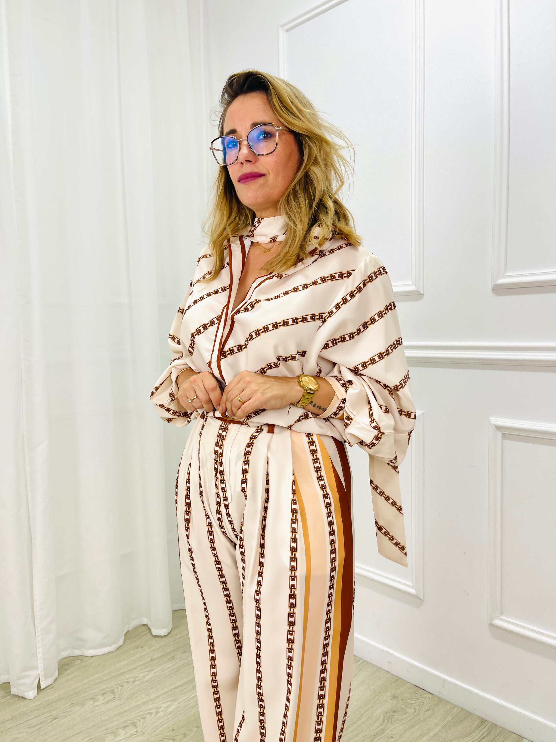 CONJUNTO CAMISA E CALÇA ACETINADO TONS TERRA